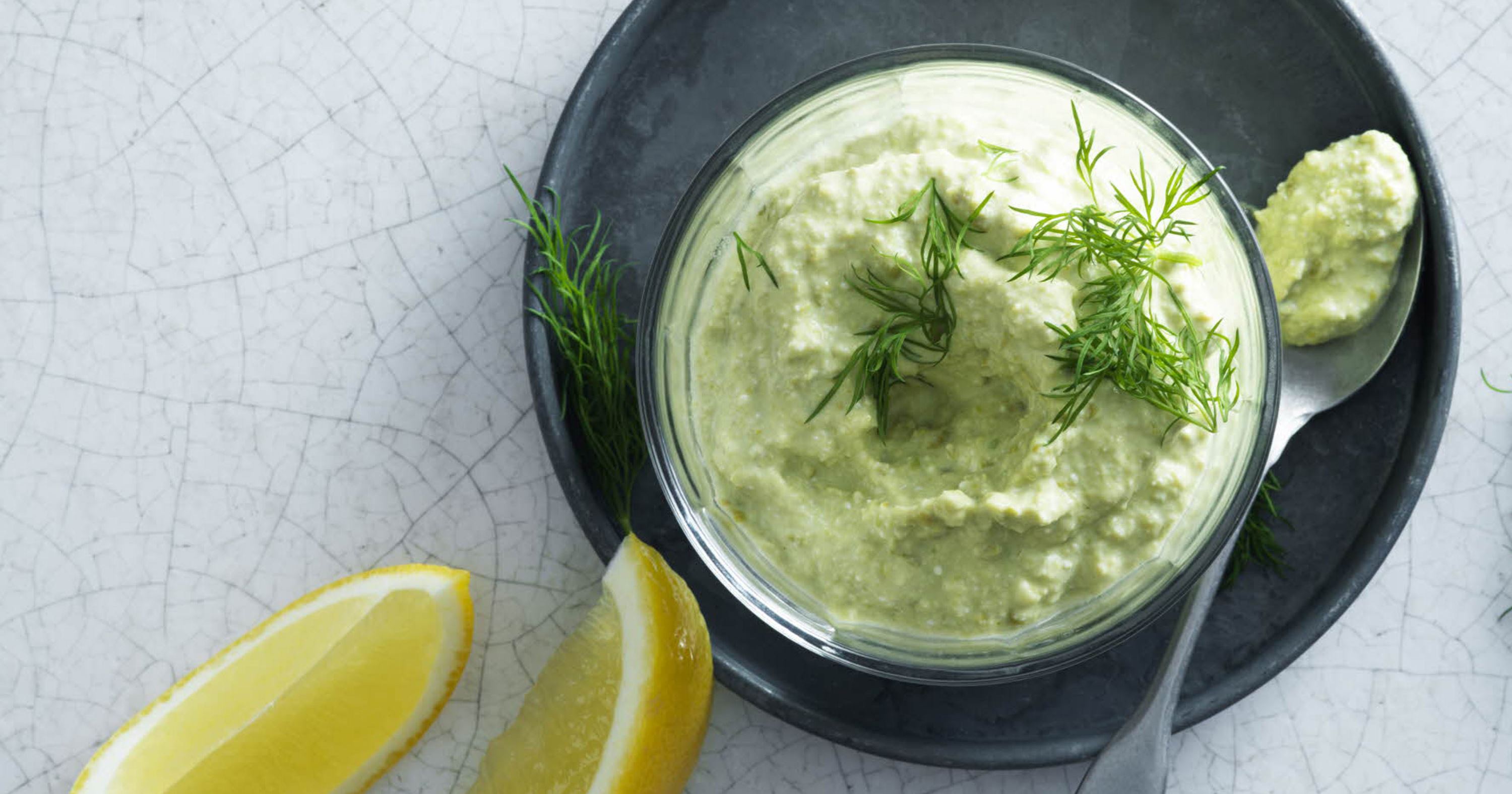 Fin grøn ærtedip, der også kan bruges som kold sauce til fisk og grøntsager.(Karolines Køkken)