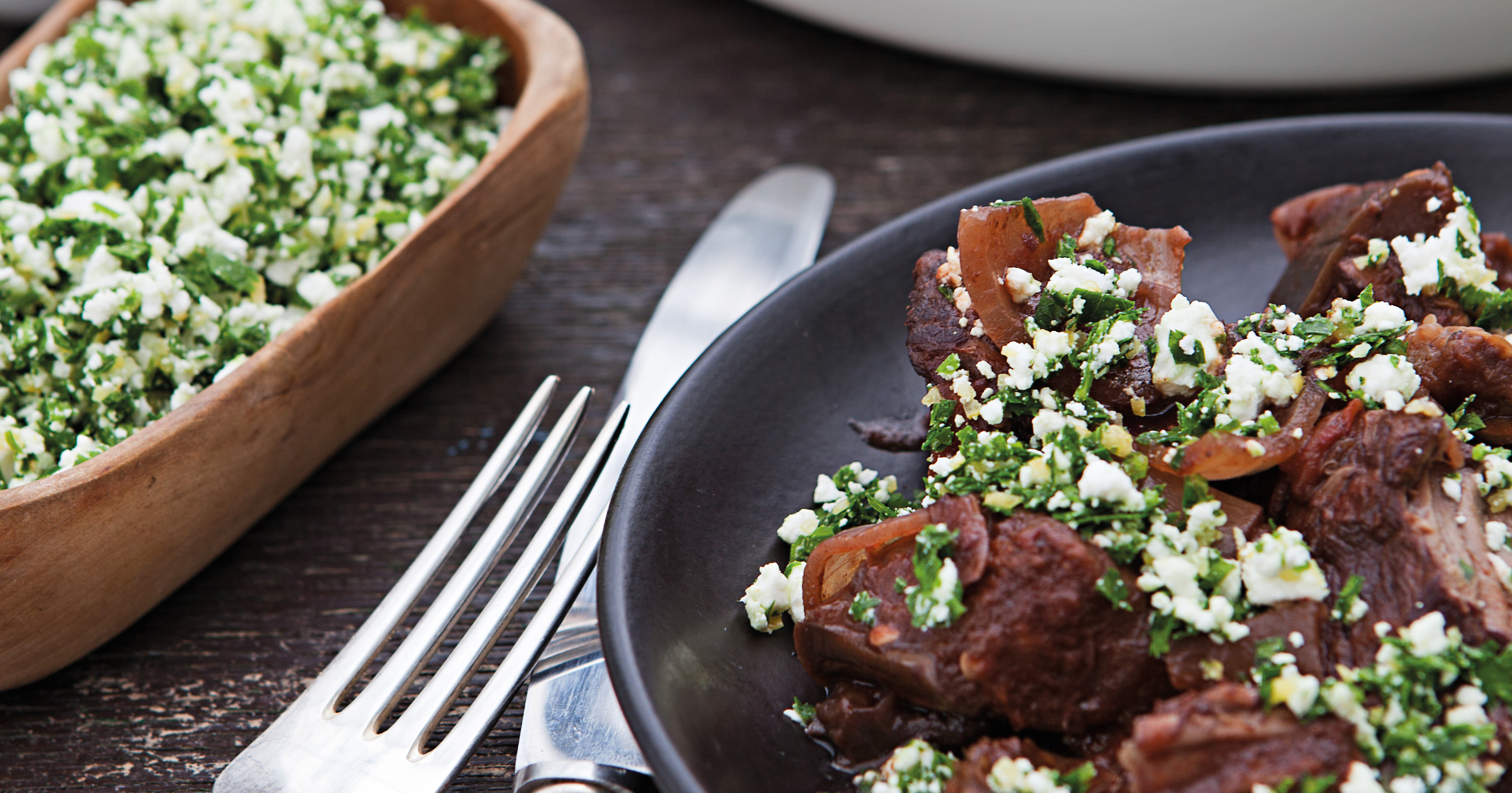 De lækre grisekæber er super gode til en rigtig hyggelig gang simremad. Sammen med bl.a. dadler og rødvinssauce får du en ret fuld af skøn smag.(Karolines Køkken)